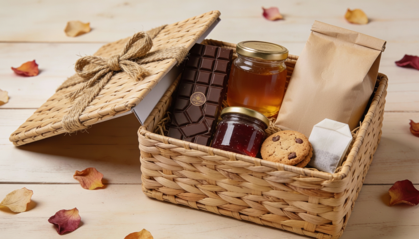 Selecciones personalizadas de productos de comercio justo en elegantes cestas para ocasiones especiales. Cestas de fibras naturales tejidas a mano, perfectas para regalos solidarios. Listas para personalizar con productos ecológicos y justos.